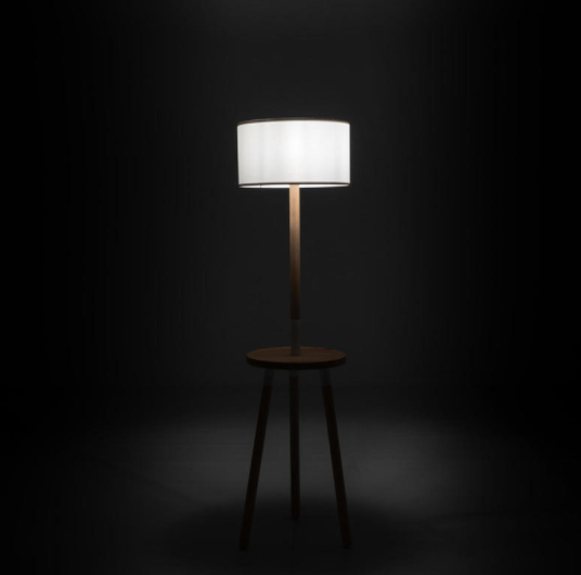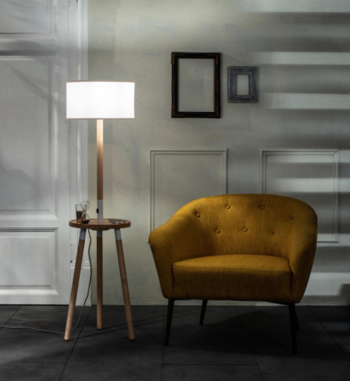 Struttura in legno di faggio con piano d’appoggio con presa USB integrata e ricarica wireless per telefono. Cavo telato nero con interruttore a pedale.