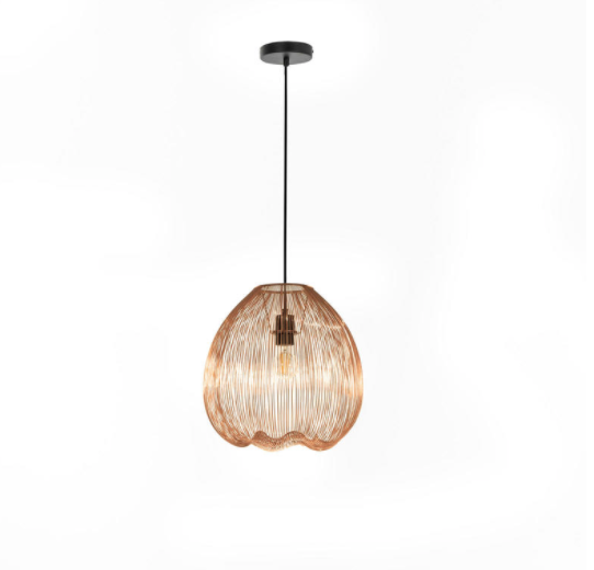 Lampada con paralume e struttura in metallo verniciato nero oppure color rame. Cavo telato con interruttore, predisposto per 1 lampadine E27 max 40W (non in dotazione).