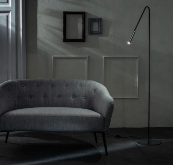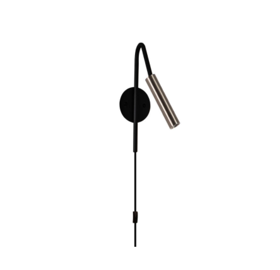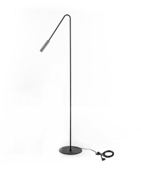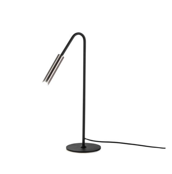 Lampada a LED con struttura in metallo verniciato e paralume a tubo in metallo nichelato. Disponibile nella versione da tavolo, da terra oppure da parete.