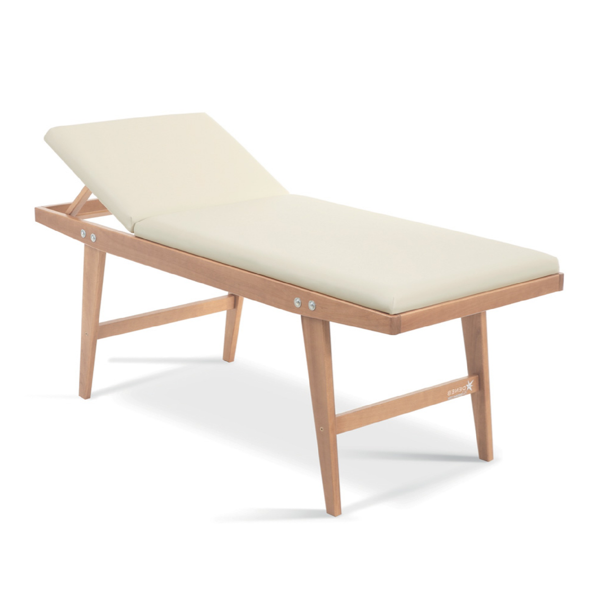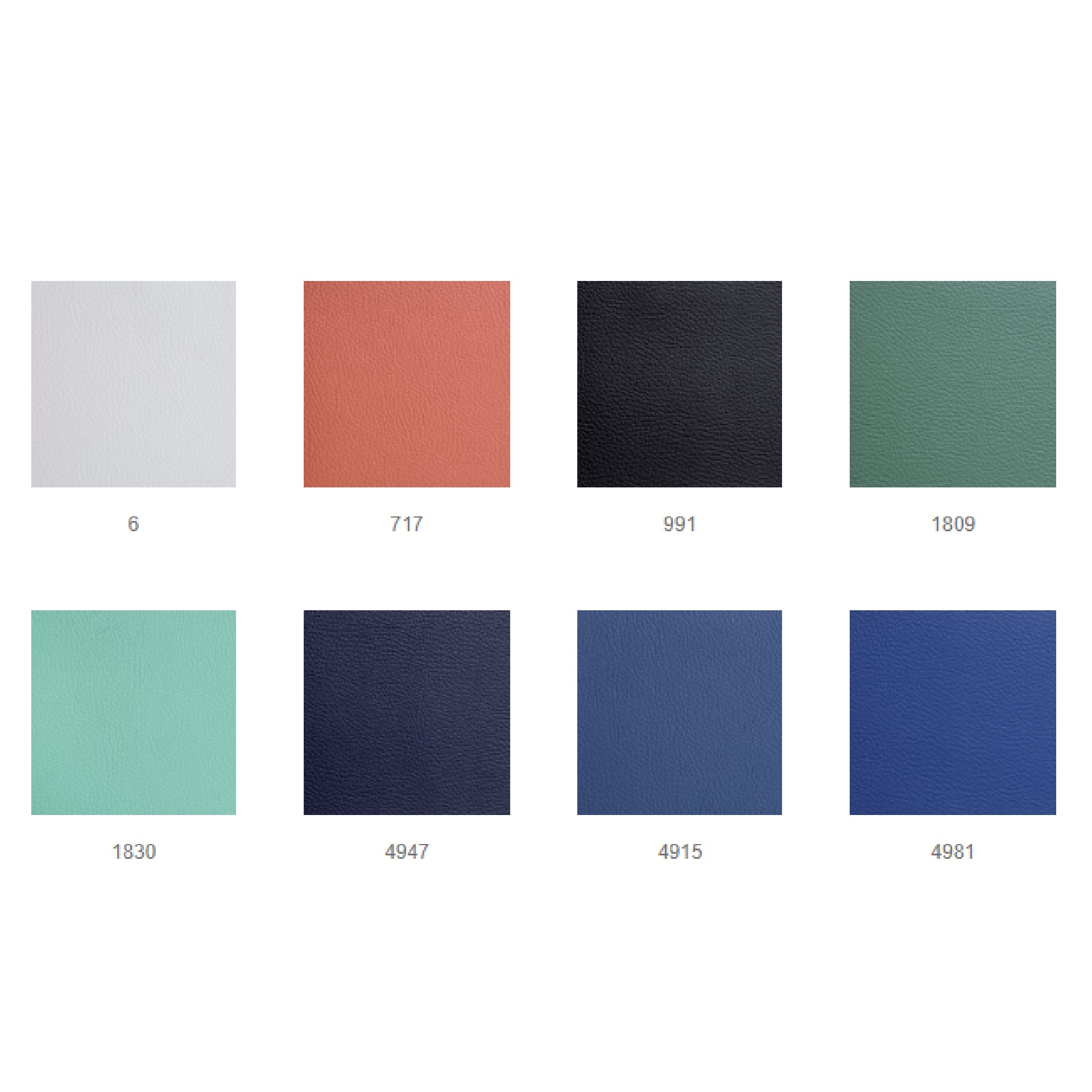 Struttura in legno, faggio naturale, imbottitura in poliuretano alta 5cm. Rivestimento in similpelle lavabile classe 1IM, verniciatura con prodotti ad acqua.