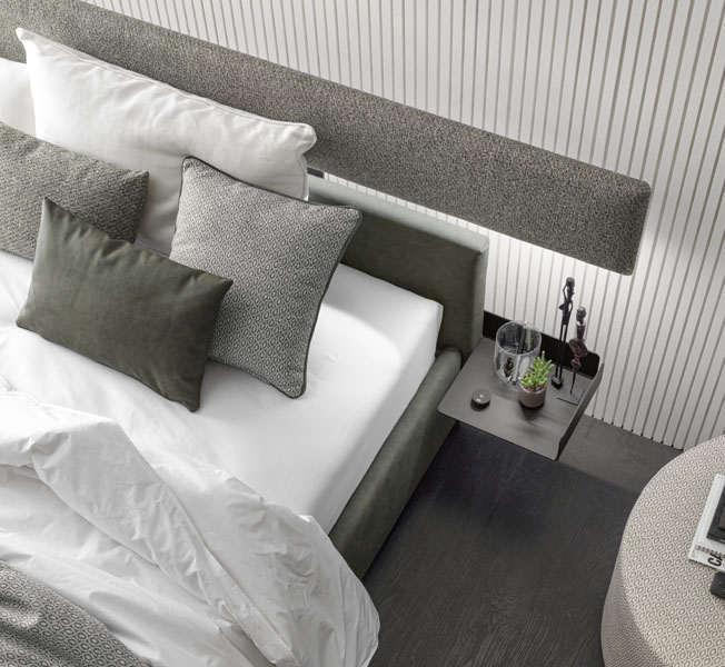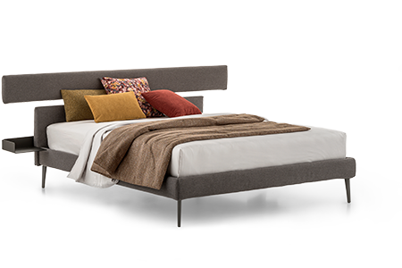 Originale e multifunzionale: un letto con comodini integrati, elementi che contraddistinguono la testata assieme ad un pannello imbottito di maggiore lunghezza. Per un design autentico.