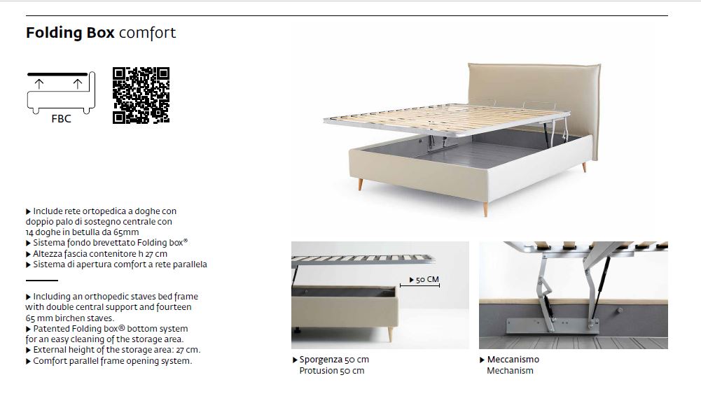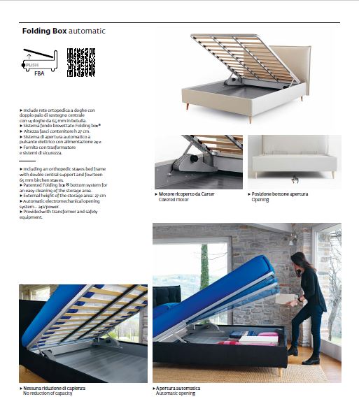 Comprende di serie: rete a doghe con doppia traversa, meccanismo di sollevamento e ferramenta doppio telaio, fondo contenitore Folding Box (a tapparella) completamente sfoderabile. Disponibile anche con sistema Folding Box Comfort e Folding Box Automatico, con sistema di apertura automatico a pulsante elettrico con alimentazione (fornito con trasformatore e sistemi di sicurezza).