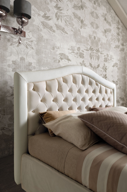 Dama scompone le usuali sembianze del reale per approdare a originali esiti compositivi, simboleggiati dall’inusitata testiera dal caratteristico profilo a cappello da gendarme che racchiude in una composta cornice l’animato ritmo dell’autorevole capitonné, cadenzato da regolari bottoni in tessuto o da più intriganti cristalli decorativi.