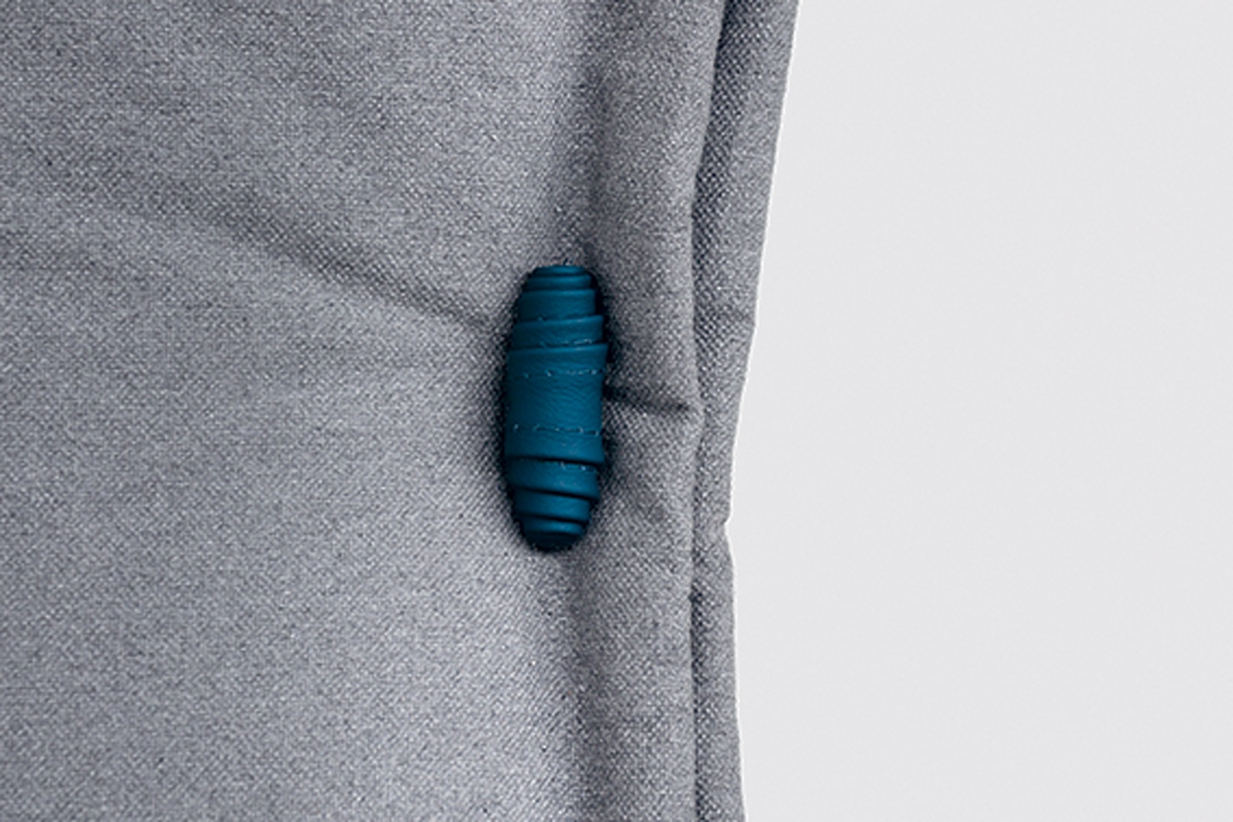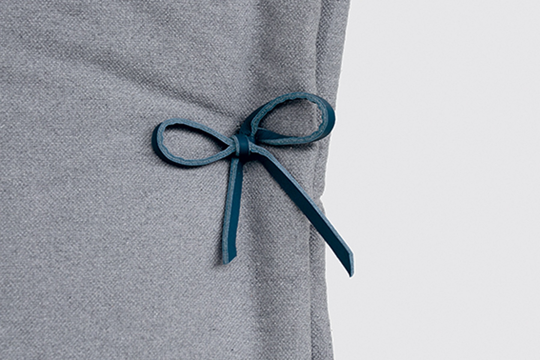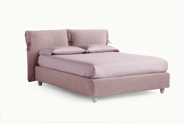 Può essere rifinita con il classico fiocco o con il nuovo alamaro; entrambi possono essere scelti nello stesso tessuto del letto, oppure in cinque diversi colori in vera pelle.