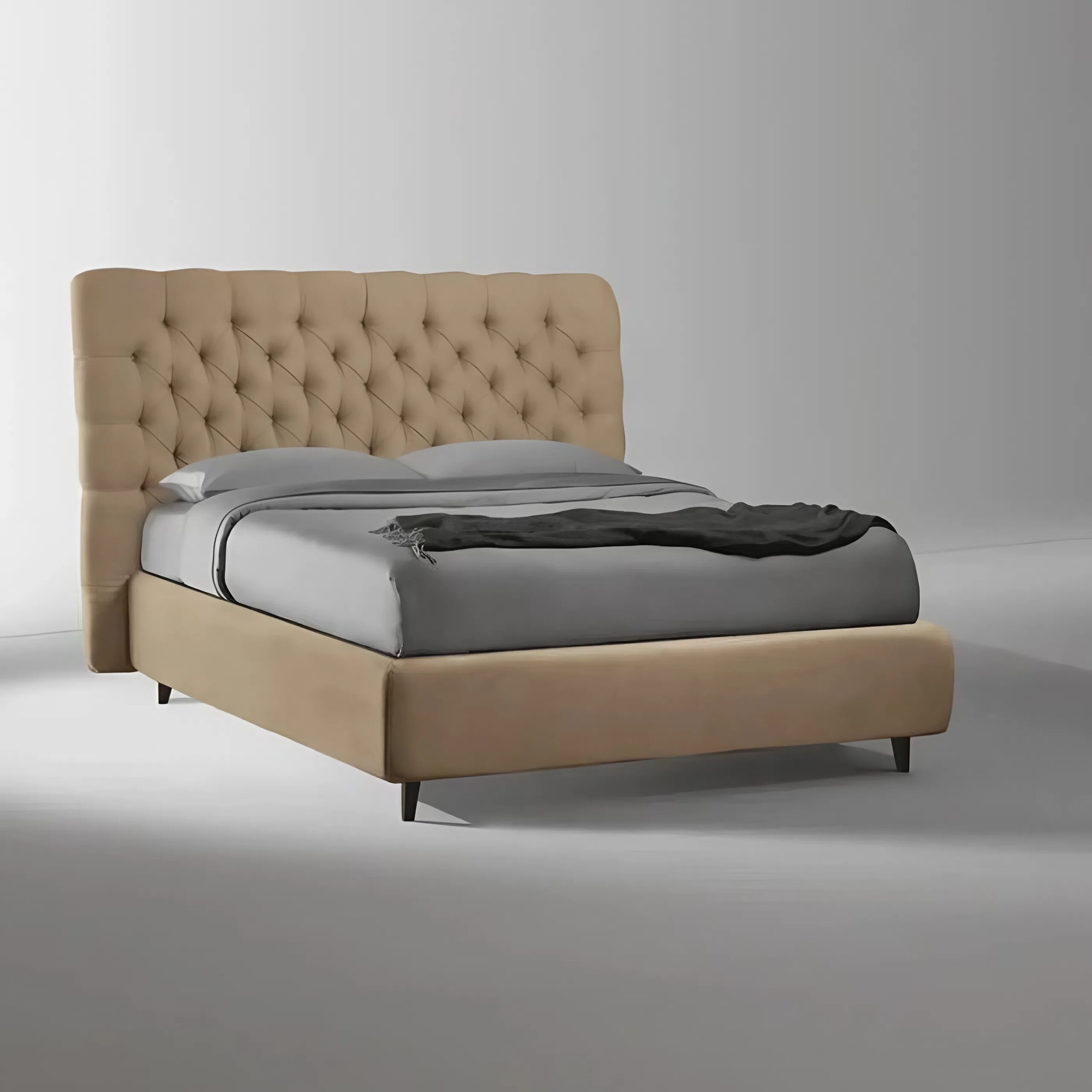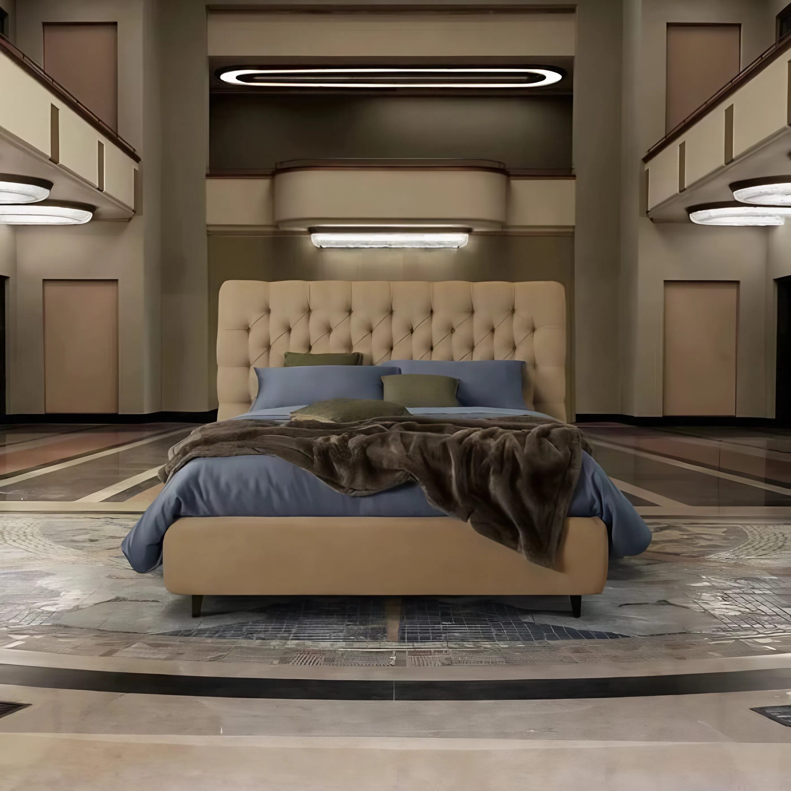 Il capitonné diventa protagonista con un effetto tridimensionale che dona profondità e carattere alla testiera. Un design scenico che esalta la raffinatezza classica intramontabile.