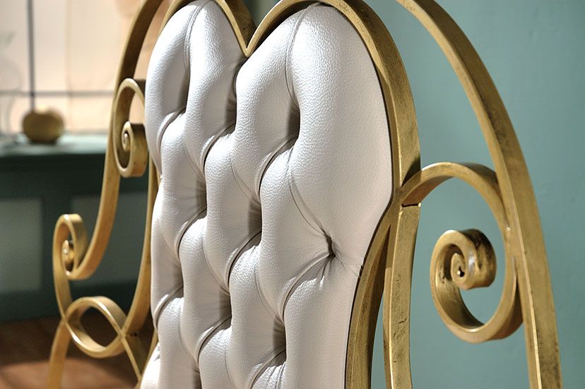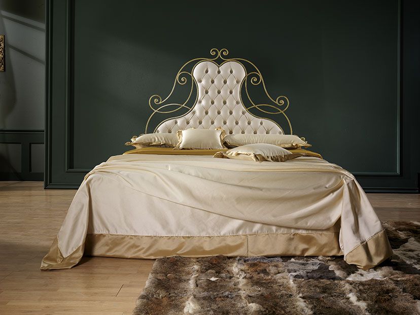 Letto dall’estetica imponente con testata imbottita e rivestita in ecopelle nera o bianca. La struttura può essere realizzata con finitura anticato argento, oro o nero.