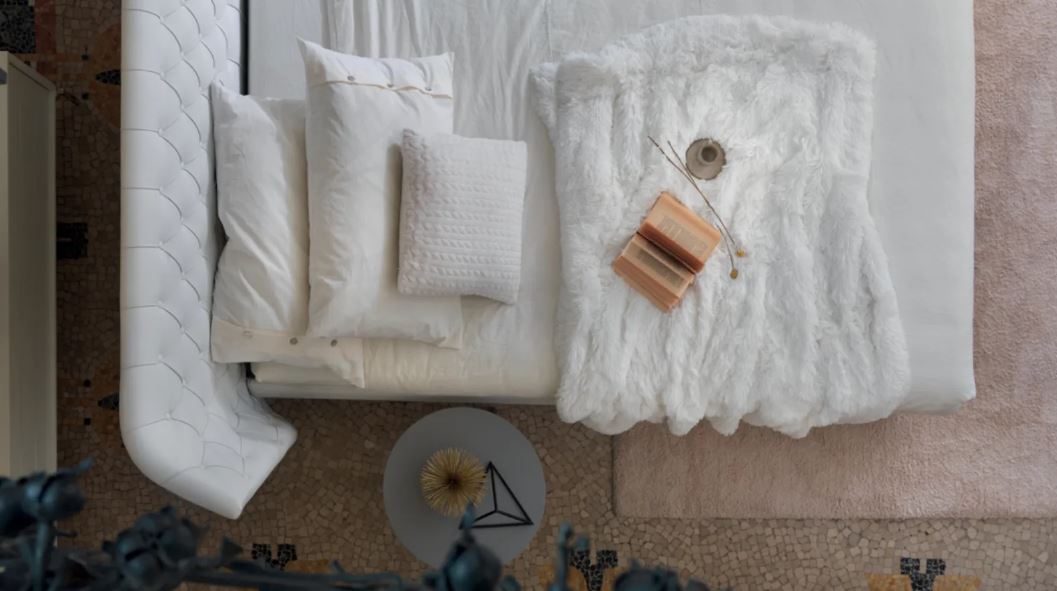 Letto scenografico con testiera avvolgente per un effetto alato, impreziosita dalla lavorazione capitonné in vari tessuti e texture.