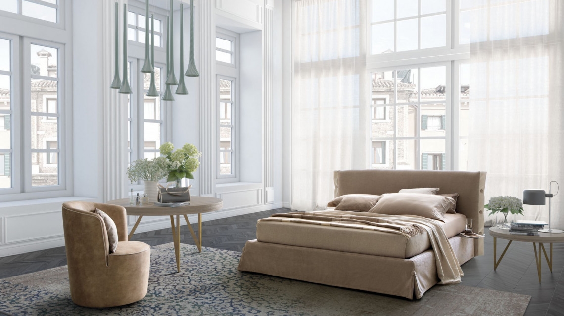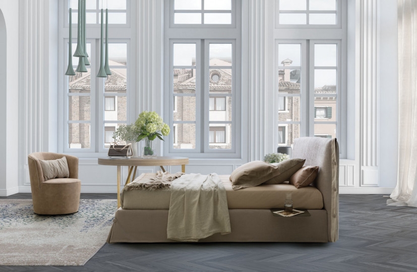 L’ironia e l’eleganza fanno di Giselle un letto contenitore dalla personalità ben delineata, un’icona di stile. Non un semplice rivestimento in tessuto per la base ma una raffinata gonna con spacco laterale; non una convenzionale testiera imbottita ma un immenso cuscino foderato i cui bottoni laterali non possono che richiamare le chiusure di ricercati soprabiti.
