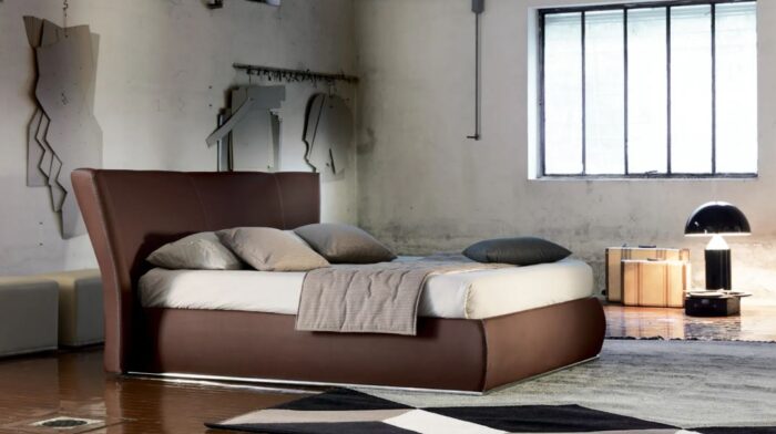 Letto moderno con importante testiera e giroletto alto imbottito.