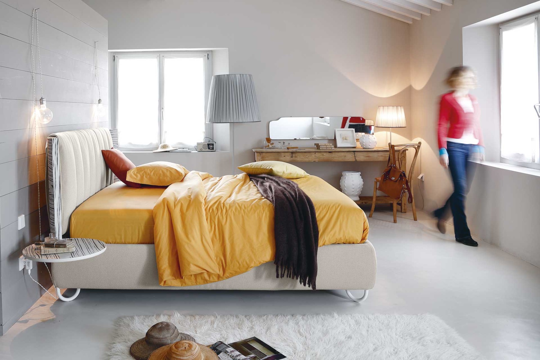 Una proposta originale quella offerta da Hug 01 Lines. Una vera “calza” in tessuto trapuntato avvolge il pannello in legno della testata.