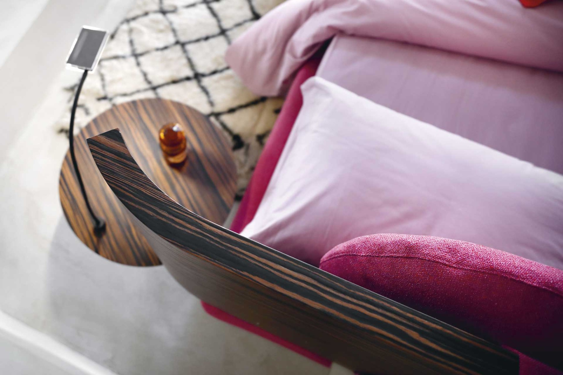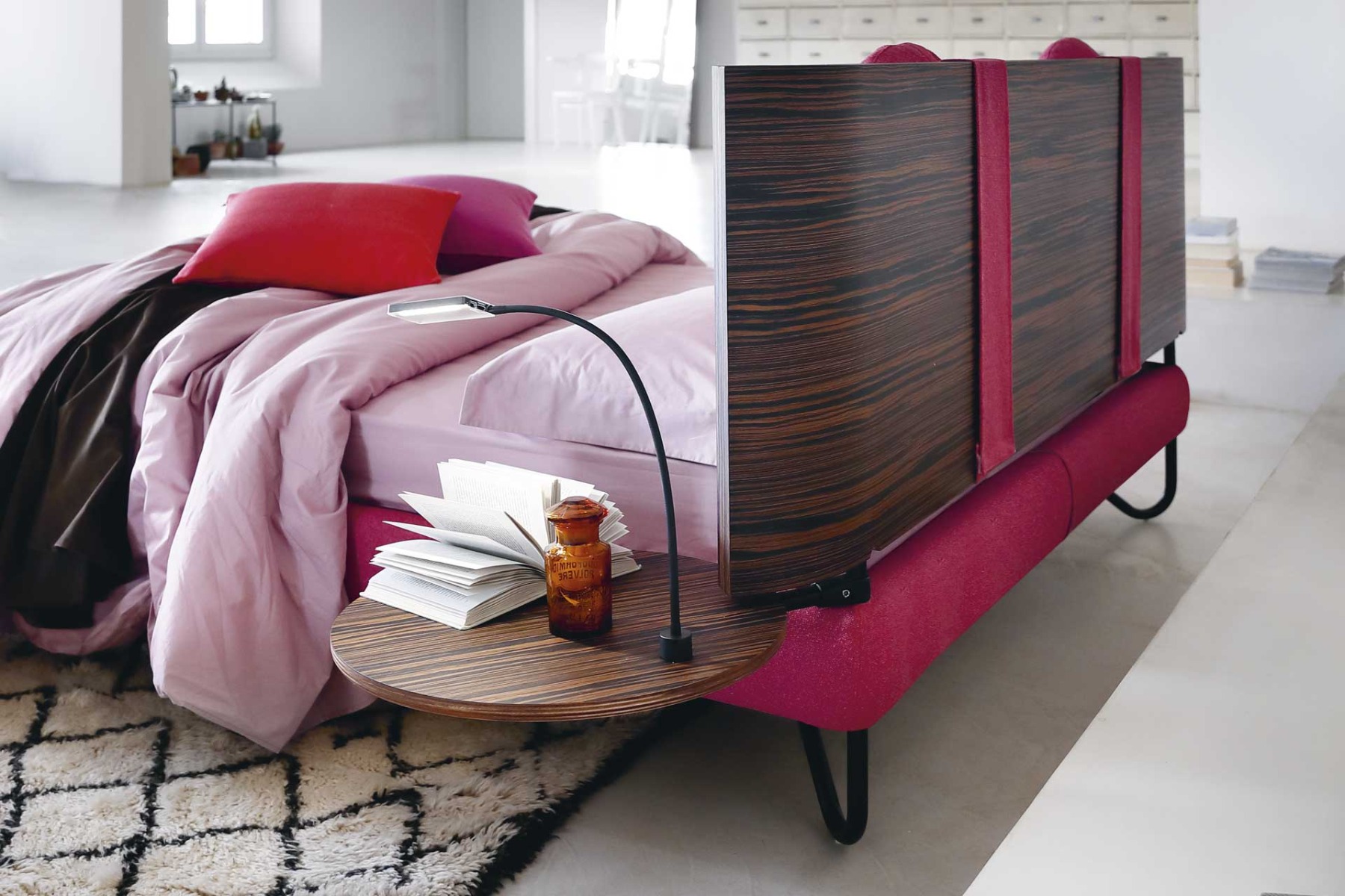 Realizzati in schiumato ad alta densità e rivestiti con tessuto abbinato al giroletto, arricchiscono e aggiungono confort al pannello della testata in legno disponibile a sua volta in diversi colori e finiture.