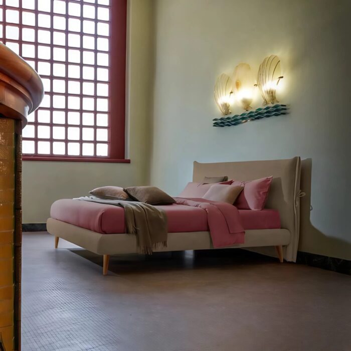Uno stile intramontabile e trasversale: la testiera lineare, imbottita e impreziosita da volant e fiocchetti laterali, dona un’eleganza discreta e senza tempo alla camera da letto.