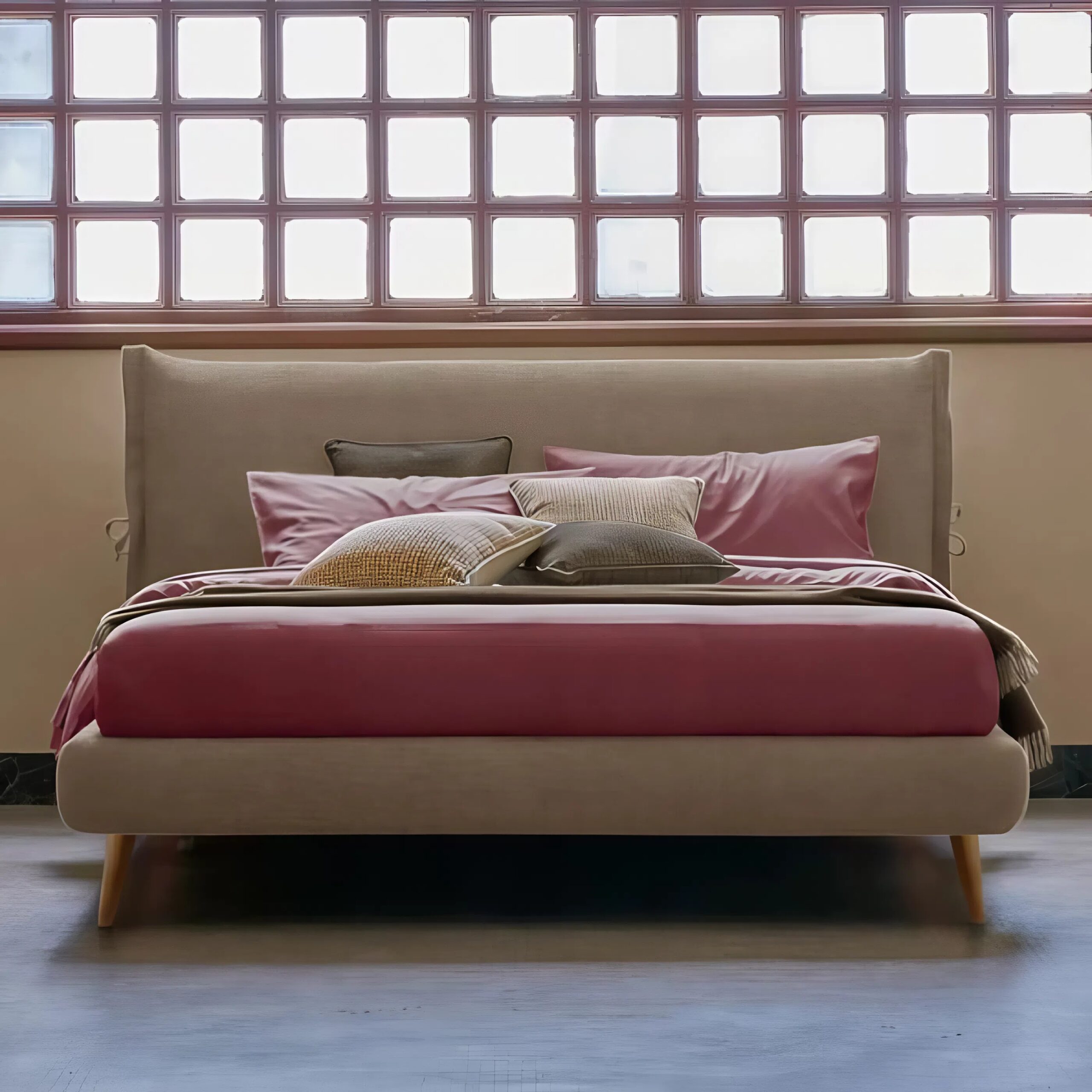Il letto Marina ha un look semplice ed elegante: la testiera, sapientemente imbottita, termina ai lati con delicati volant chiusi da un fiocchetto.