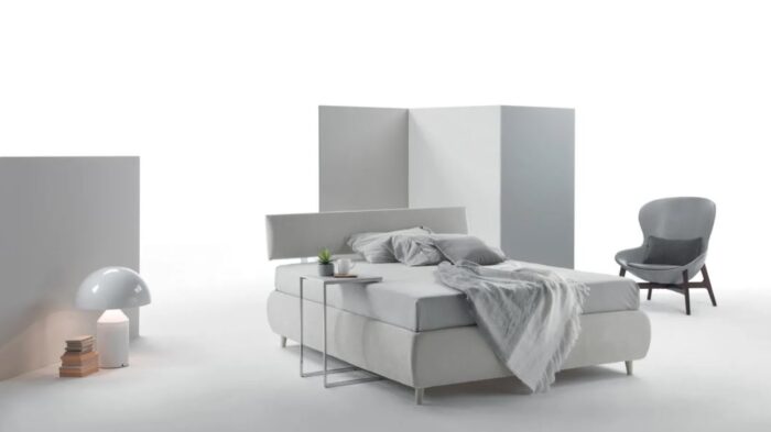Il modello in foto appartiene al nostro ricco catalogo di letti moderni disponibili con rivestimento in tessuto. Piedini e giroletto a scelta.