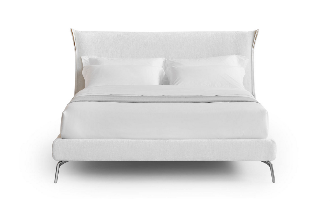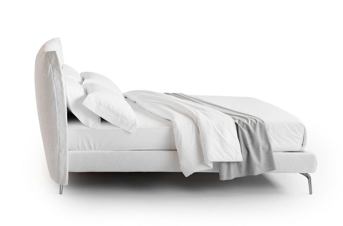 Imbottitura soffice per una testata curvata e avvolgente. Il voulant laterale è ripiegato come per formare una morbida semiluna, in perfetta armonia con le curve del letto.