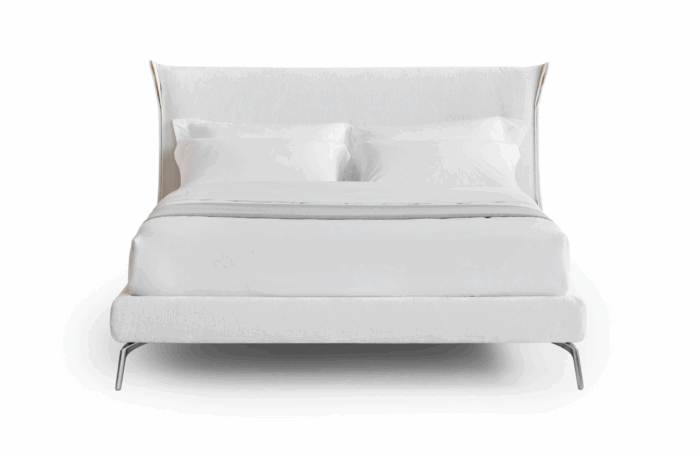 Imbottitura soffice per una testata curvata e avvolgente. Il voulant laterale è ripiegato come per formare una morbida semiluna, in perfetta armonia con le curve del letto.