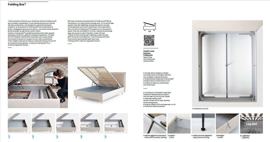 Comprende di serie: rete a doghe con doppia traversa, meccanismo di sollevamento e ferramenta doppio telaio, completamente sfoderabile. Contenitore dotato del rivoluzionario sistema Folding Box ideato e brevettato Noctis, la rivoluzione sta nel pannello di fondo, ripiegabile senza alcuno sforzo, che rende estremamente facile accedere al pavimento sotto il letto