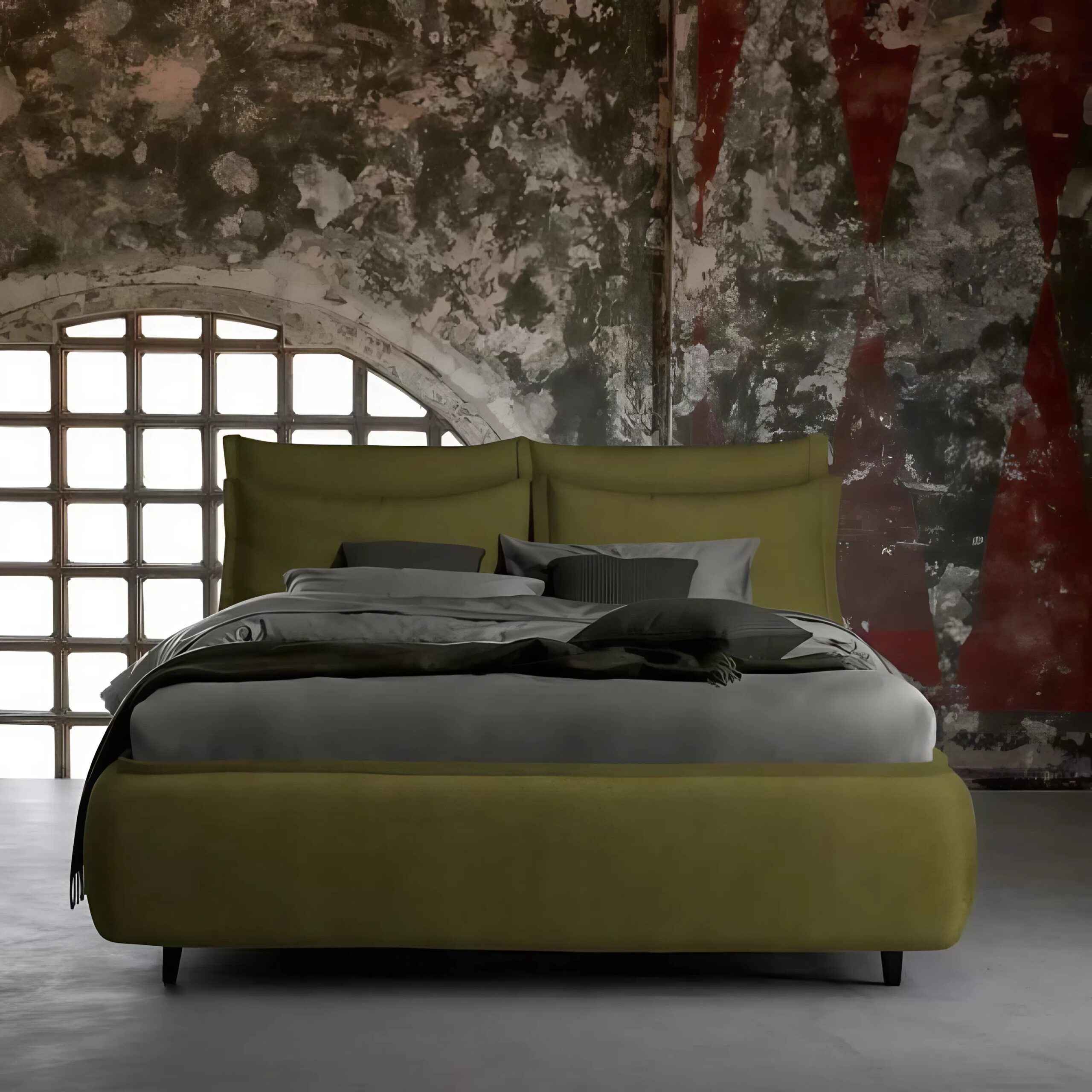 Somnia è un letto dai volumi morbidi e generosi: il giroletto imbottito e la testiera, che integra voluminosi cuscini, evocano momenti di meritato relax. Lo stile informale è maggiormente evidenziato anche grazie alla scelta del rivestimento che lo rende l’elemento d’arrendo perfetto per ambienti accoglienti.