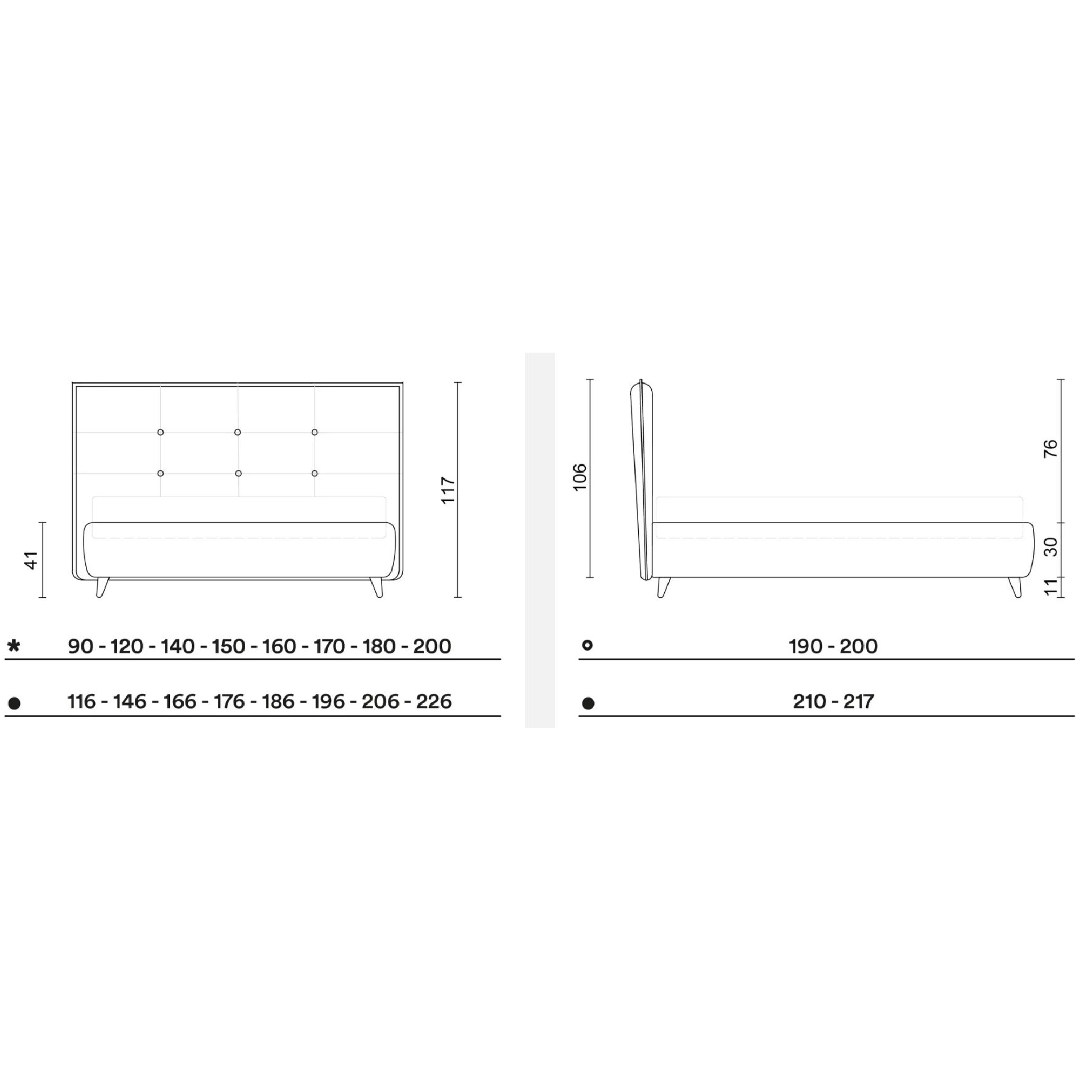 - La testiera è caratterizzata da una contemporanea trapuntatura geometrica decorata con bottoni, che richiama la classica capitonnè, rivisitata in chiave contemporanea e meno voluminosa.