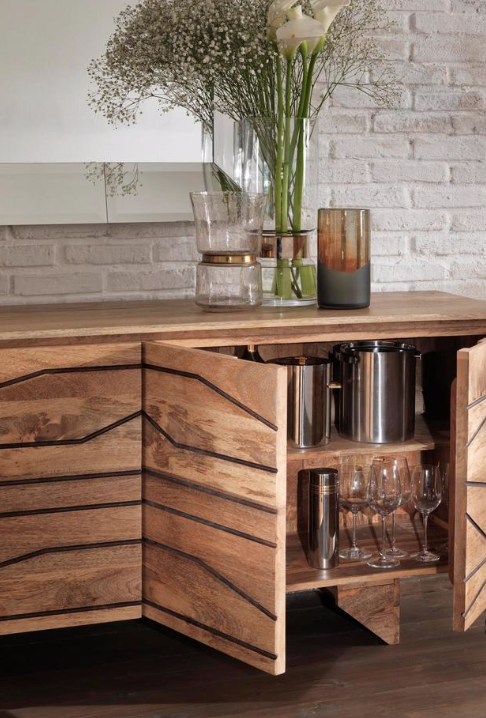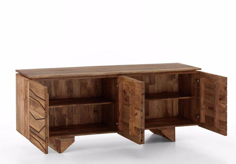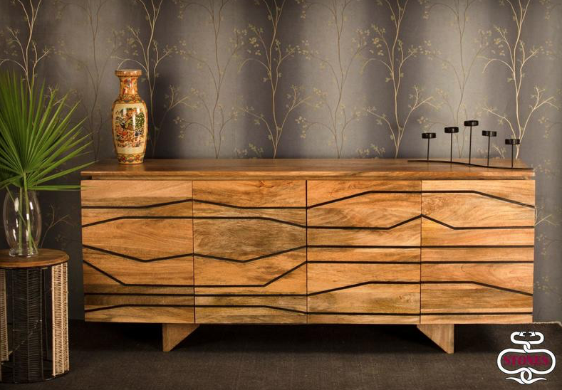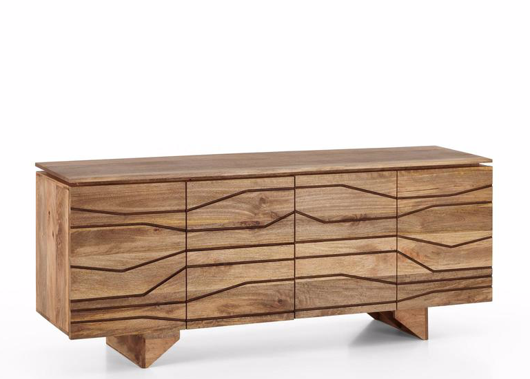 La madia CHITRA è in legno di mango, presenta venature naturali e striature nere.