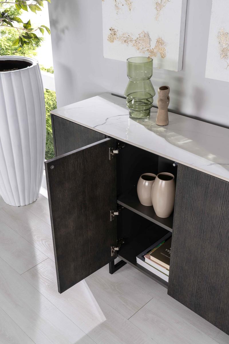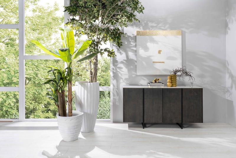 Il top in ceramica Marmo Calacatta dalle delicate venature poggia sulla raffinata, quanto discreta struttura in rovere grigio scuro. Il meccanismo push&pull con chiusura ammortizzata e le dimensioni contenute 160 x 40 x 85 cm, rendono questo mobile compatibile con le abitazioni moderne che privilegiano la funzionalità, ma non rinunciano a un tocco di classe.