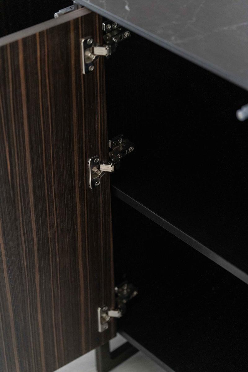 La pregiata finitura del top in ceramica Marmo Nero Portoro rende la madia Omega un gioiello che dona agli spazi una personalità unica.