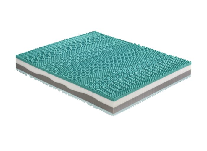 La lastra del materasso Blow nasce dell’abbinamento di quattro versioni di Beneform. I masselli sono uniti e sagomati a zone differenziate con speciali e particolari forme. Il alto di contatto in Beneform aloe vera schiumato ad acqua con oli vegetali e microcapsule di aloe vera. La microcapsulazione dell’aloe ne controlla l’emissione e ne mantiene attive le caratteristiche grazie al rilascio lento e progressivo del principio attivo. Le parti sottostanti in Beneform air ottimizzano la distribuzione del peso in modo ottimale per un perfetto allineamento della colonna vertebrale.