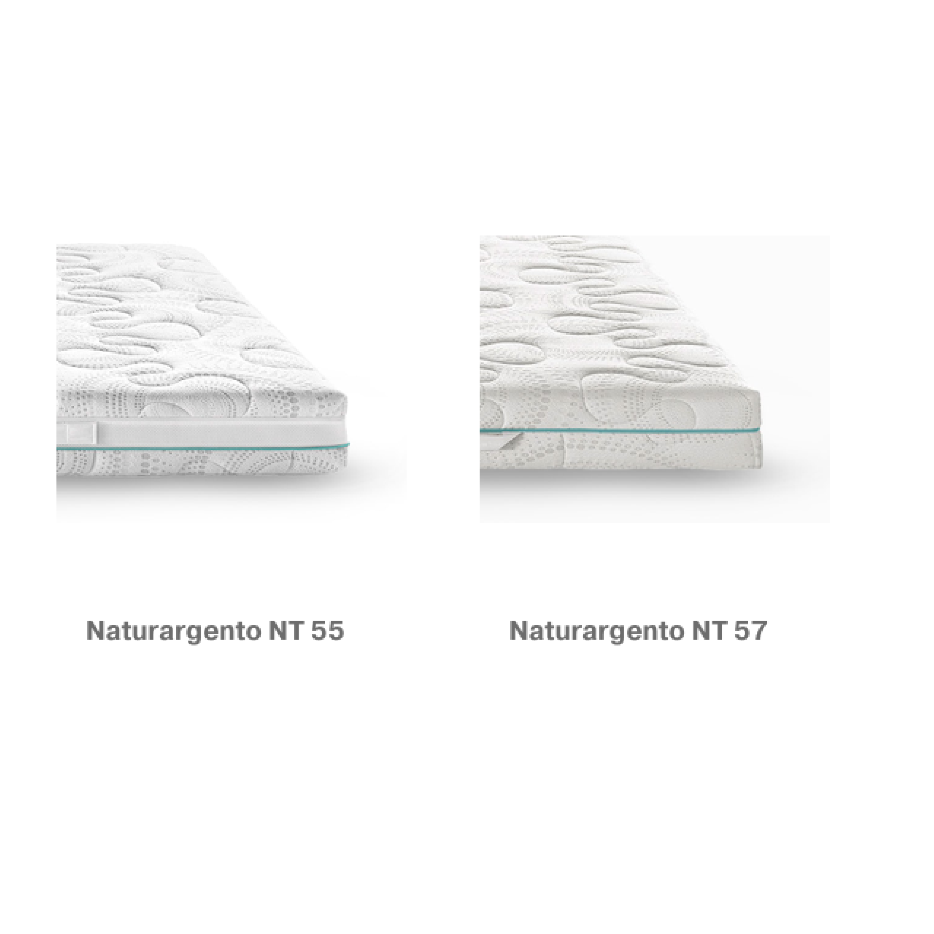 - NATURARGENTO NT55: imbottitura in fibra anallergica con zeoliti d’argento 420 gr/m² su entrambi i lati, sistema di aerazione Air inserito lungo il perimetro, maniglie in ecopelle, sfoderabile con cerniera sui 4 lati. Lavabile in lavatrice fino a 40°.