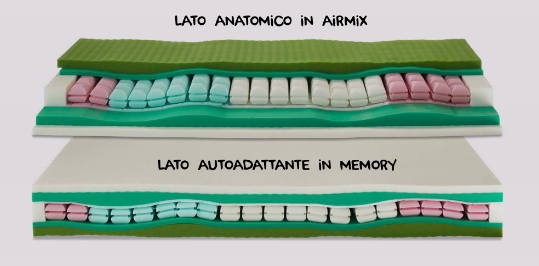 Il materasso Energy è composto da un lato anatomico in Airmix e da un lato autoadattante in Memory.