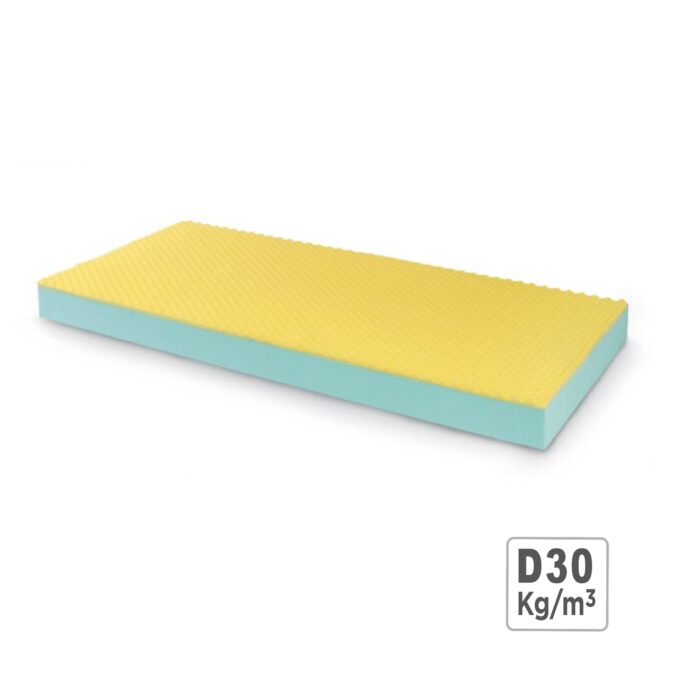 Densità 30 Kg/m3. Superficie d’appoggio in schiuma viscoelastica bugnata. Non foderato.