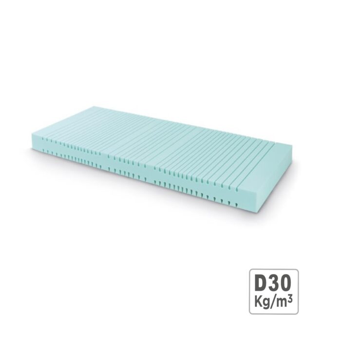 Il materasso in schiuma poliuretanica micro cellulare a cellula aperta di tipo convenzionale. Lavorazione ovoidale, Densità 30 Kg/m3. Utilizzabile su entrambi i lati. Non foderato.