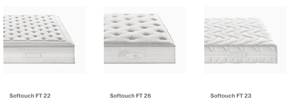 - SOFTOUCH FT26: realizzato con il pregiato Micro Tencel, ricavato da piante di eucalipto FSC, esaltato dall’esclusiva lavorazione High Definition. Il risultato è un rivestimento elegante e raffinato con una straordinaria morbidezza, altamente termoregolante ed antibatterico. Imbottitura in cotone con zeoliti d’argento 500 gr/m² su entrambi i lati. Bordatura classica. Sistema di aerazione Air inserito lungo tutto il perimetro. Rivestimento sfoderabile e lavabile a 40°.