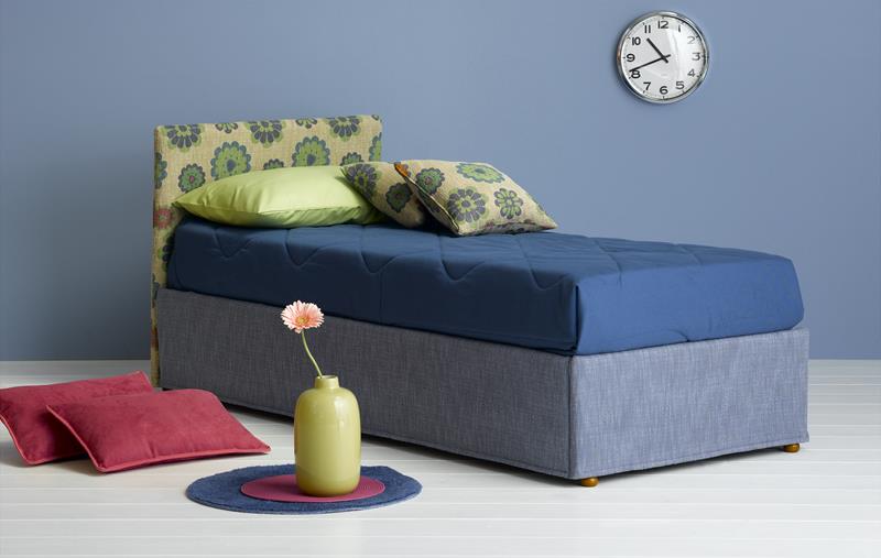 Letto singolo con testata completa di rete a doghe e rivestimento completamente sfoderabile.
