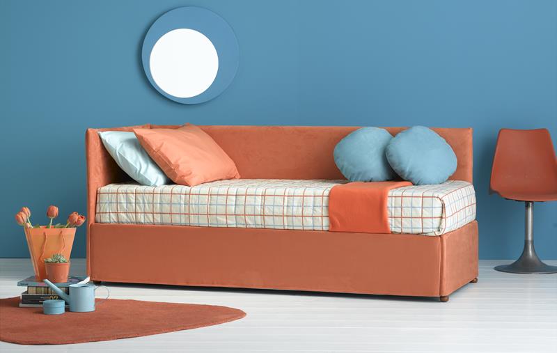 Letto singolo con testata destra o sinitra, schienale imbottito, completa di rete a doghe e rivestimento completamente sfoderabile.