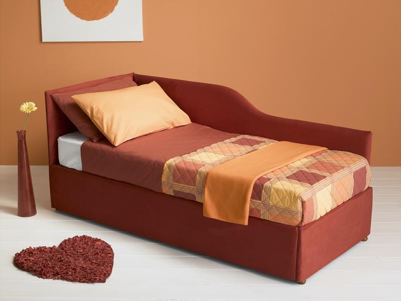 Letto singolo con testata destra o sinitra, schienale sagomato, completa di rete a doghe e rivestimento completamente sfoderabile.