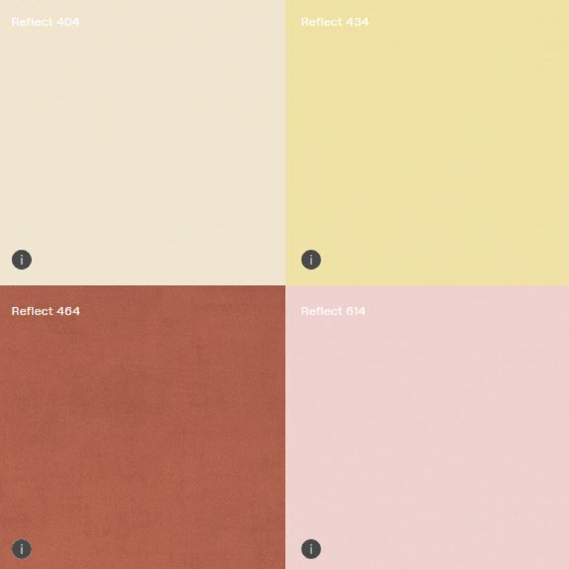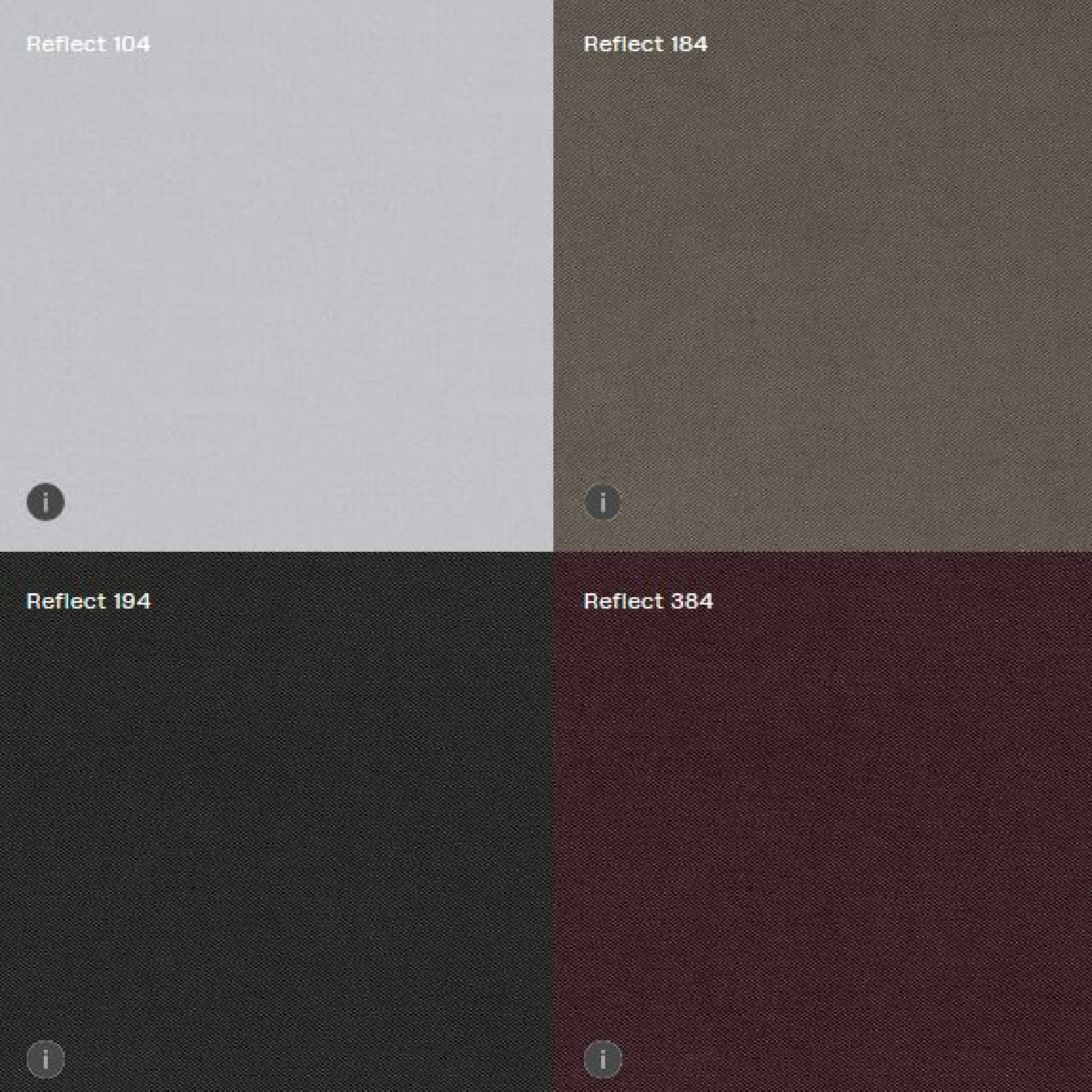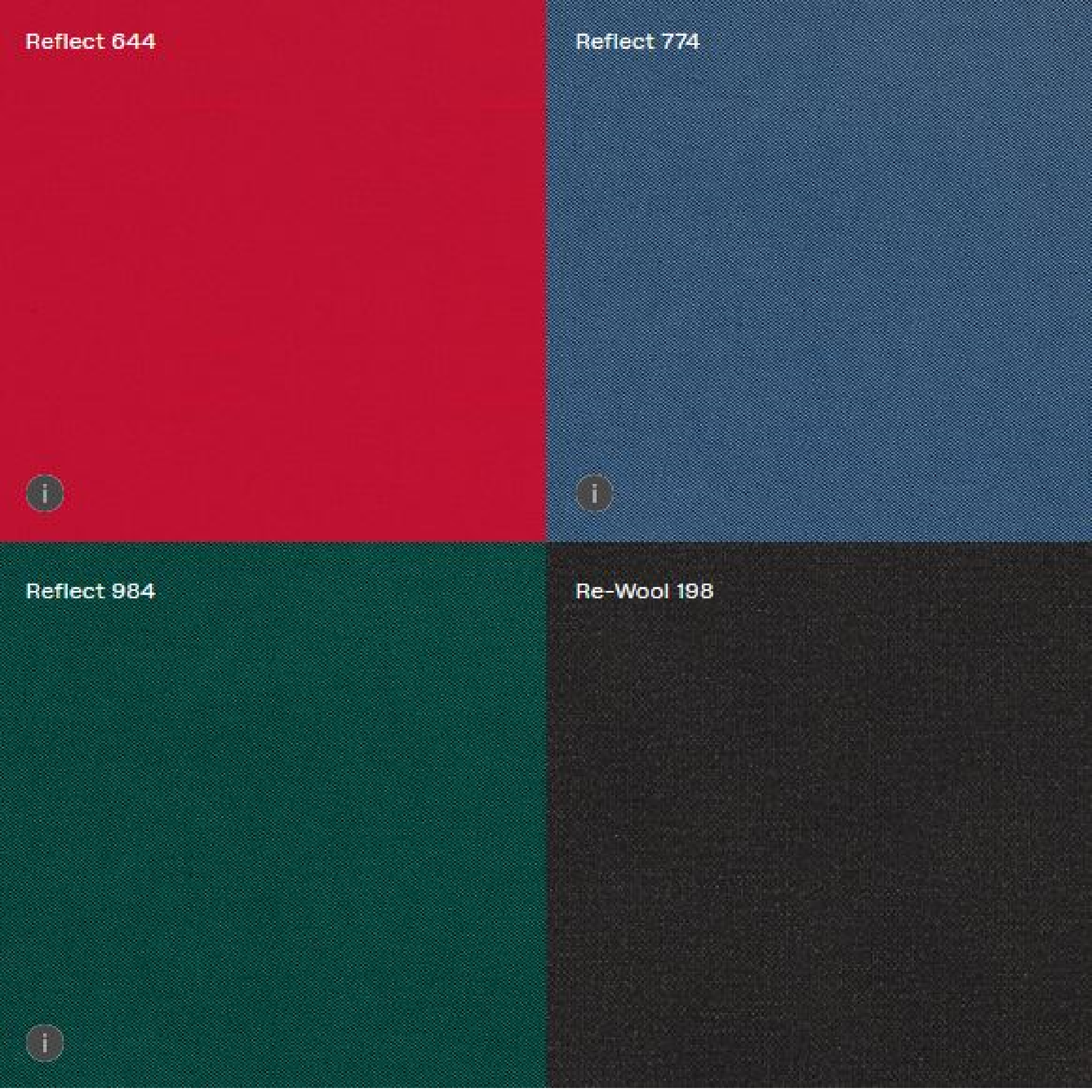Colori categoria REFLECT o RE-WOOL. Reflect è un elegante tessuto twil composto di poliestere riciclato, particolarmente morbido e delicato. Nitto è un tessuto a maglia di lana che risalta grazie ai colori brillanti. Re-wool è prodotto utilizzando il 45% di lana riciclata, è un tessuto ricco e con un alto profilo di sostenibilità.