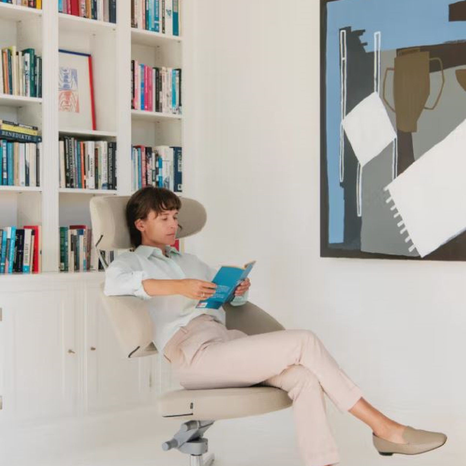 Il meccanismo di reclinazione è regolabile in base al peso corporeo e reagisce con delicatezza al movimento naturale del corpo, mentre la sua forma è progettata per sostenere la schiena proprio dove serve.