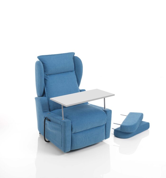 La poltrona Karol offre anche la possibilità, una volta smontati i due braccioli, di montare un piano di appoggio. Questo rende possibile svolgere attività di riabilitazione o di svago. Il piano può essere regolato in profondità grazie ad un sistema a calamita, ed è realizzato in nobilitato bianco. Comodo e facile da montare, finito il bisogno, non avrete nessuna difficoltà a smontare il tavolino stesso e a riporre al loro posto i braccioli.