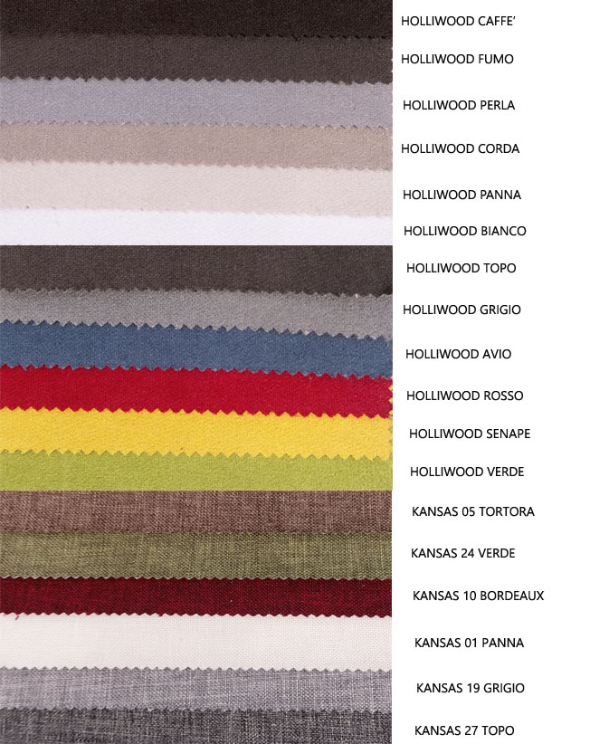 Disponibile in tessuto HOLLYWOOD (100% PL, idrorepellente, antimacchia, lavabile a 30°), e in tessuto KANSAS (100% PES, idrorepellente, antimacchia, lavabile 30°).