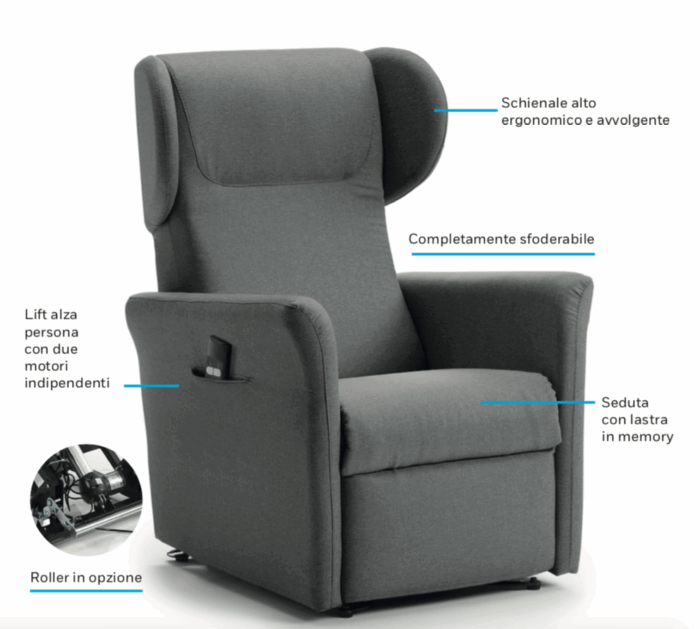 La poltrona Rita ha una meccanica con 2 motori ciò significa che consente di personalizzare al massimo la posizione di riposo, permettendo di regolare indipendentemente l’inclinazione dello schienale e della pediera. Il movimento Lift Alza persona aiuta nel sollevamento, quindi accompagna l’utilizzatore nella messa in piedi riducendo al minimo gli sforzi.