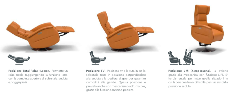 Meccanismo di movimento a 2 motori: consente di personalizzare al massimo la posizione di relax inclinando schienale e pediera indipendentemente. Si può raggiungere così la posizione Total Relax (letto) oppure la posizione TV/Lettura in cui lo schienale resta perpendicolare alla seduta e la pediera si solleva per garantire comodità alle gambe. La meccanica Lift- Alza persona è fondamentale in tutte quelle situazioni in cui la persona trova difficoltà per rialzarsi dalla posizione seduta.
