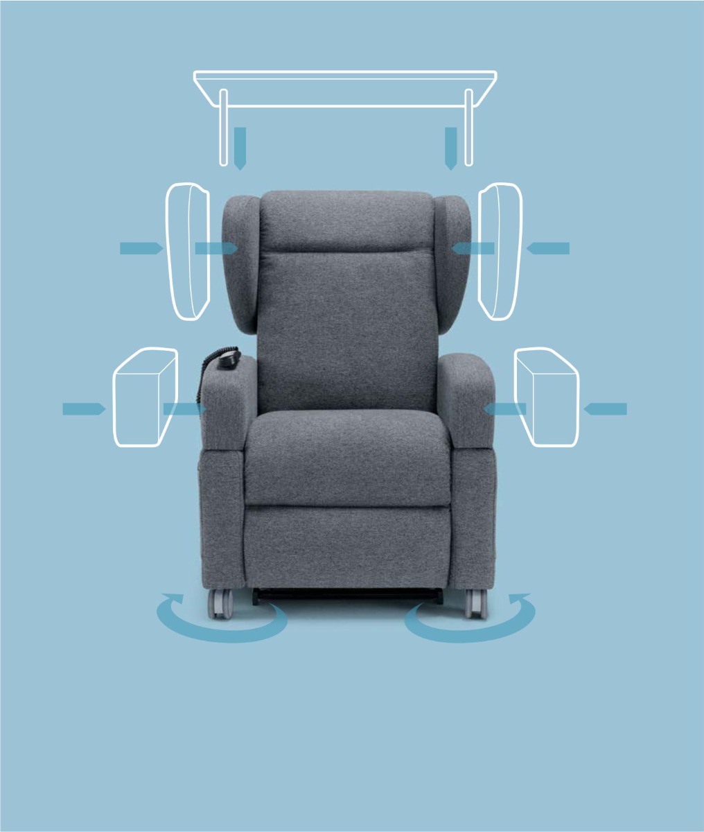 - 4 motori: oltre alle classiche posizioni relax e lift può assumere anche posizioni molto funzionali ai fini ortopedico-sanitari, utili soprattutto nei casi in cui si abbiano esigenze fisiche che obbligano a restare seduti sulla poltrona. il sistema consente infatti sia di inclinare la poltrona verso l’alto in posizione gravità zero, che di effettuare un innalzamento della poltrona di circa 20 cm, conservando la seduta parallela al pavimento. Questo movimento consente l’avvicinamento ad un tavolo per il pranzo o ogni altra esigenza, restando comodamente seduti. Ogni stress e disagio da cambiamento di posizione viene così agevolmente evitato.