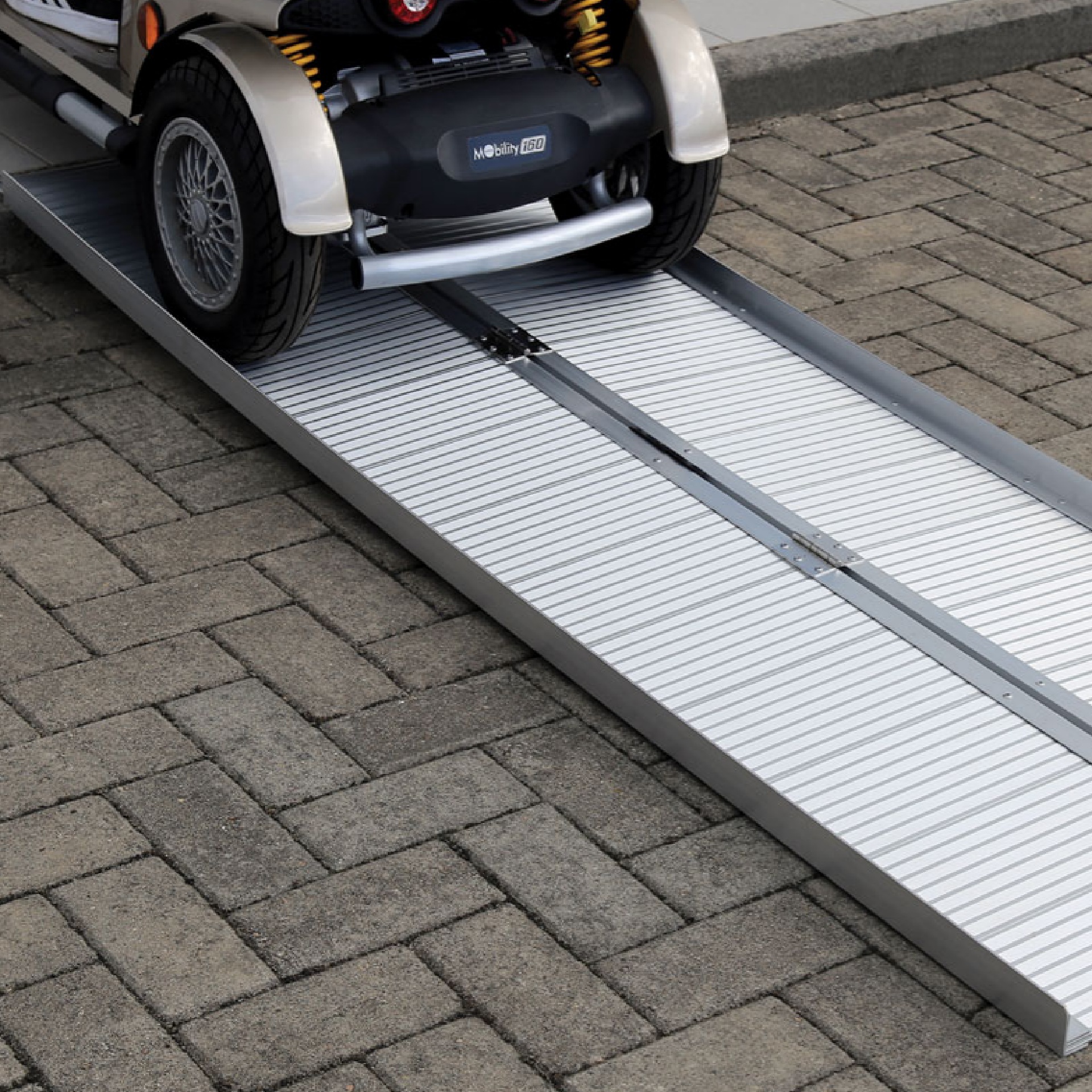 Rampa destinata all’abbattimento delle barriere architettoniche sia dentro che fuori casa, in viaggio o nelle semplici attività giornaliere. Indicata per persone con difficoltà motorie, deve essere installata con l’ausilio di un operatore. Struttura in alluminio antiscivolo e antiruggine con maniglia per il trasporto. Cerniere in acciaio inox.