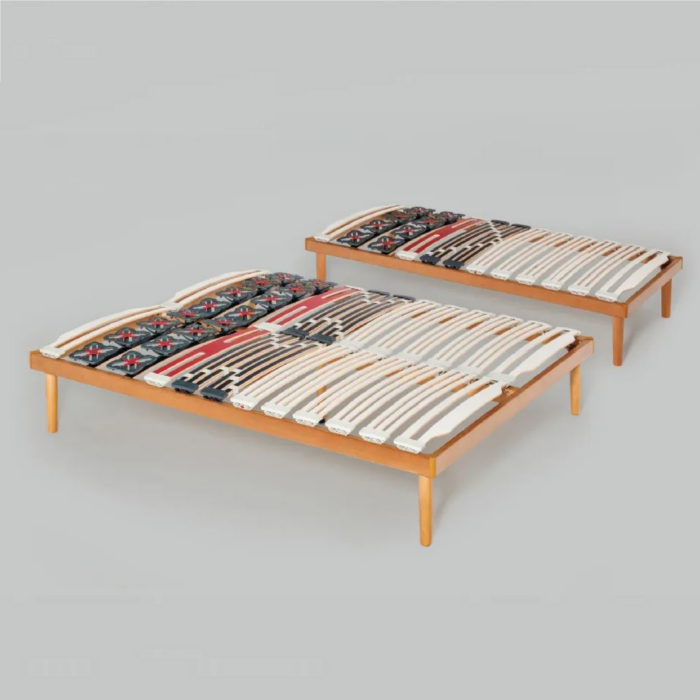Il piano di riposo è composto da doghe da 25 mm, e risulta adatto a conformarsi puntualmente alle diverse posizioni assunte durante il riposo. Ciascuna diga inserita in supporti in SEBS e TPEE, flessibili e robusti, consentono di ottenere diverse prestazioni dei vari elementi, che basculando ammortizzano i movimenti così da assecondare in modo naturale le forme del corpo. SEBS è un elastomero termoplastico molto resistente, che risulta indistruttibile; TPEE è un elastomero termoplastico dalle eccellenti qualità di resistenza al taglio e alla compressione. La sospensione si caratterizza per l’ampia escursione del molleggio adatto ad accogliere la forma ad S della colonna vertebrale. Il porta doghe in SEBS, morbido e antiscivolo, garantisce che il materasso non si sposti; Il molleggio in TPEE ha eccellenti doti elastiche ad ampia escursione. La struttura del piano di riposo risulta così articolata: zona testa e piedi con doga sagomata terminale, zona spalle con elementi indipendenti 3D  portanza media, zona lombare con doga rinforzata per giusto sostegno alla lordosi, zona bacino con regolatori di rigidità ad anello (consentono di rendere più flessibile o decisa la portanza della zona del bacino: spostando gli anelli dal centro verso l’esterno aumenta la rigidità, viceversa aumenta la flessibilità), zona gambe con doghe a portanza media.