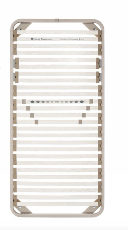 Le sospensioni in SBS lavorano all’interno del telaio, il materasso appoggia su una superficie omogenea e anatomica allo stesso tempo. La zona centrale è personalizzabile attraverso cursori di rigidità regolabili in funzione delle proprie esigenze.