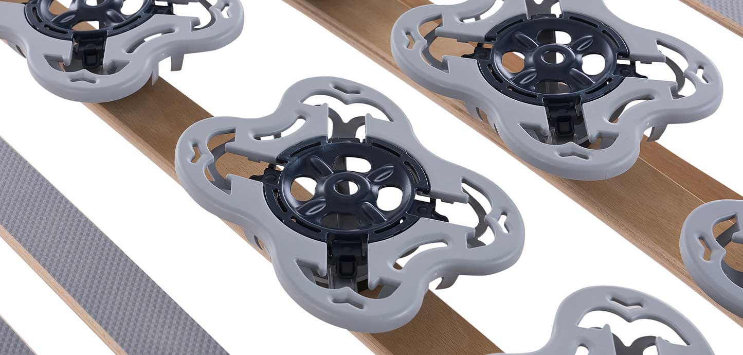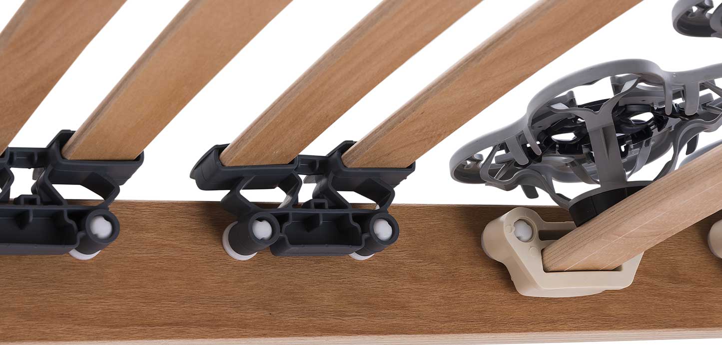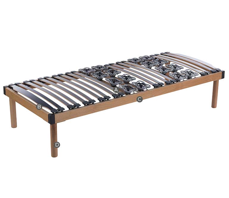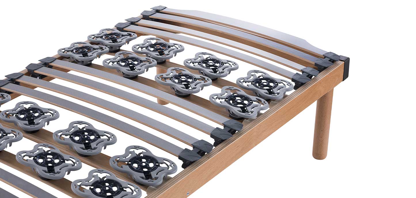 La rete è dotata anche di 26 doghe in legno di faggio con ammortizzatori in caucciù per un sostegno ottimale del corpo.