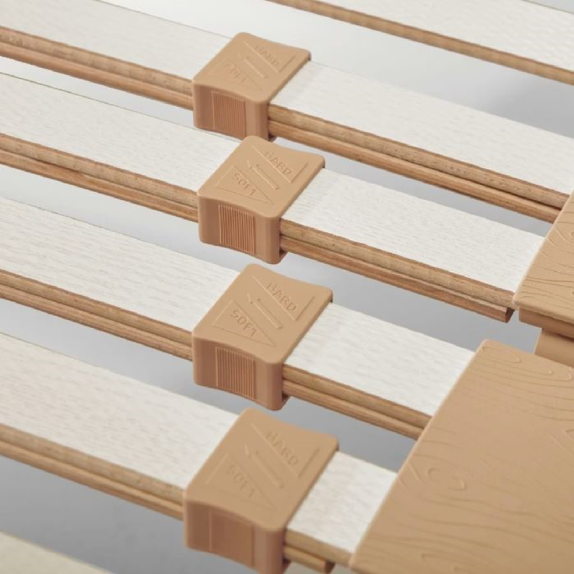 Telaio in faggio multistrato 60*30 mm certificato FSC, e doghe in faggio  multistrato con spessore 22*8 mm. Le doghe sono inserite in speciali supporti con elevate proprietà elastiche che assecondano i movimenti del materasso. La disposizione delle doghe è suddivisa in zone differenziate che assicurano un sostegno: