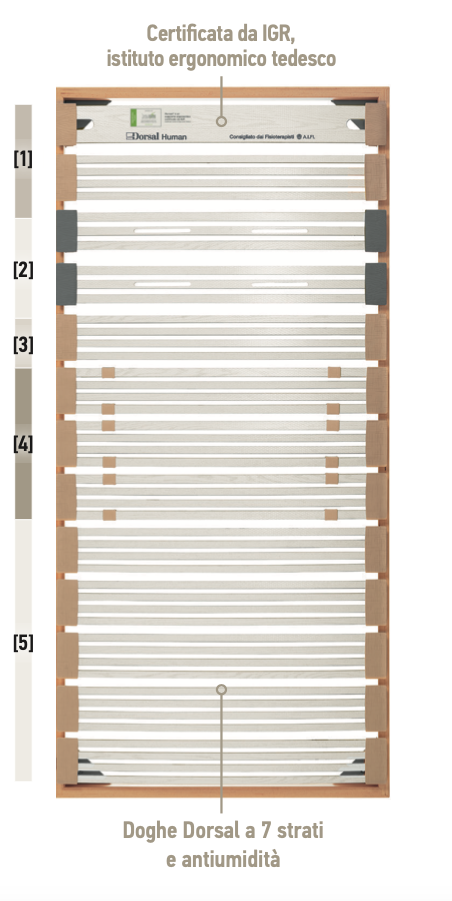 • tutti i molleggi di Human sono realizzati con le nuove doghe Dorsal a 7 strati, robuste e antiumidità