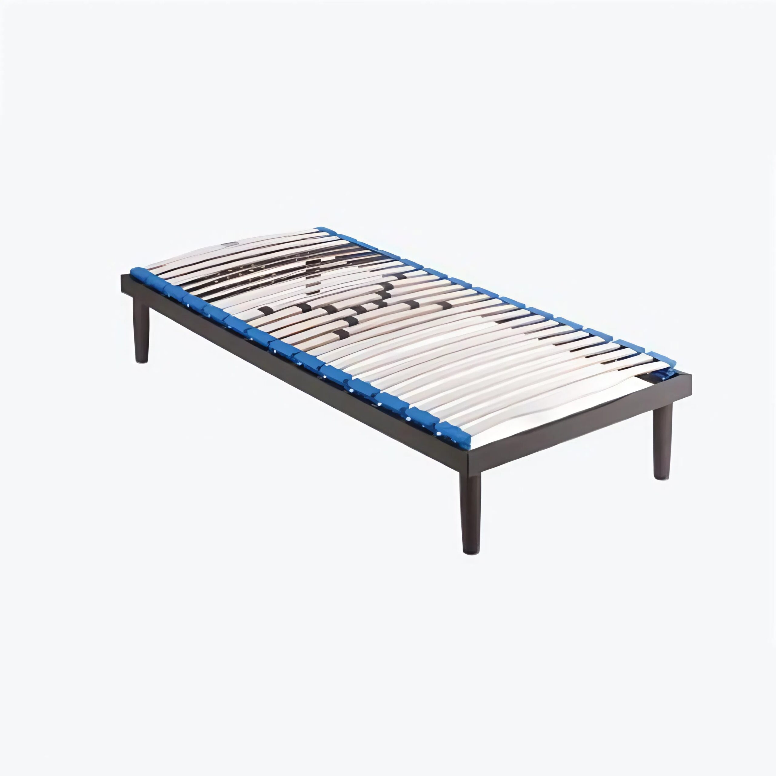 La struttura prevede solidi angolari in Nylon caricato con fibra di vetro, paraspigoli in SBS nero, sospensioni in SBS blu a filo telaio e 26/28 doghe rispettivamente per le lunghezze 190/200. Le doghe sono in faggio multistrato con finitura in cellulosa bianca e superficie strutturata per favorire la traspirazione del materasso.
