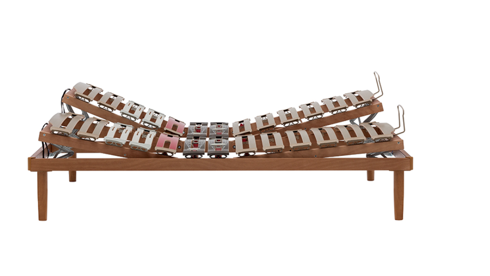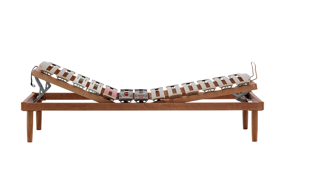 Il meccanismo di movimento manuale consente di sollevare zona testa/spalle e zona gambe, per personalizzare al massimo le posizioni di riposo. Nella versione matrimoniale le alzate sono separate, quindi ognuno può regolare a proprio piacimento la sua parte di letto, è pertanto consigliato abbinare due materassi singoli.